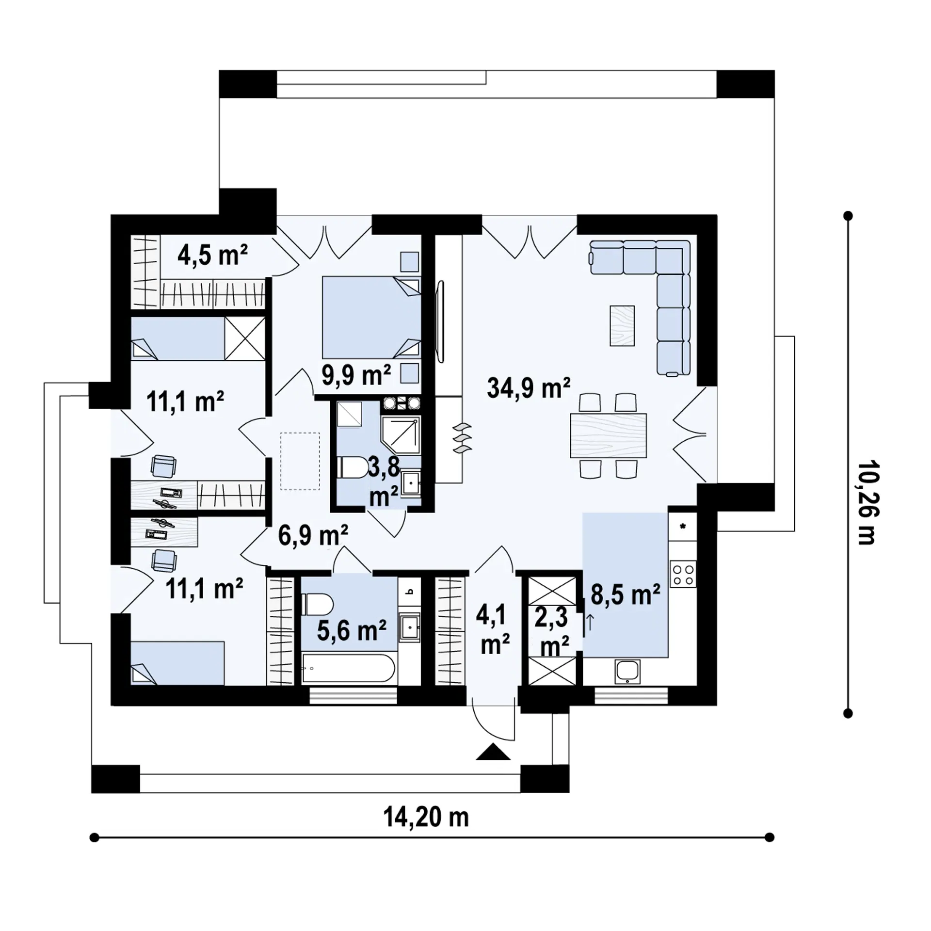 Dla najbardziej wymagających wybraliśmy projekt od lidera polskiej architektury – biura Z500. Model Z381 to ikona nowoczesnego domu parterowego. Projekt Z381 w wersji lustrzanego odbicia to funkcjonalna przestrzeń z wyraźnym podziałem na strefę dzienną (otwarty salon z jadalnią) i nocną (3 sypialnie). Duże projektowane przeszklenia zapewnią naturalne światło przez cały dzień.